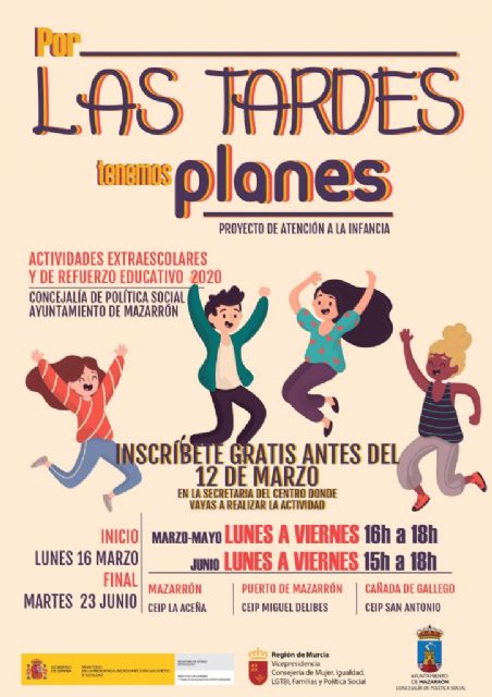 Las actividades extraescolares comenzarán a celebrarse desde el día 16 de marzo y hasta el 29 de mayo de lunes a viernes de 16 a 18 horas y desde el 1 hasta el 23 de junio de lunes a viernes de 15 a 18 horas en los colegios de 'La Aceña' en Mazarrón, 'Miguel Delibes' en Puerto de Mazarrón y el colegio 'San Antonio' en Cañada de Gallego.