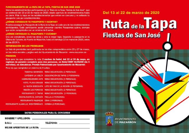 Lo que sí se mantiene es la celebración de la Ruta de la Tapa de San José que tendrá lugar desde el viernes 13 hasta el domingo 22 de marzo, ambos inclusive. "10 establecimientos participan en esta edición" ha comentado Miguel Ángel Peña quien ha destacado que "para participar en el sorteo de los premios hay que cumplimentar un mínimo de 6 sellos del pasaporte que se podrá retirar en la Oficina de Turismo y en los restaurantes y bares participantes".