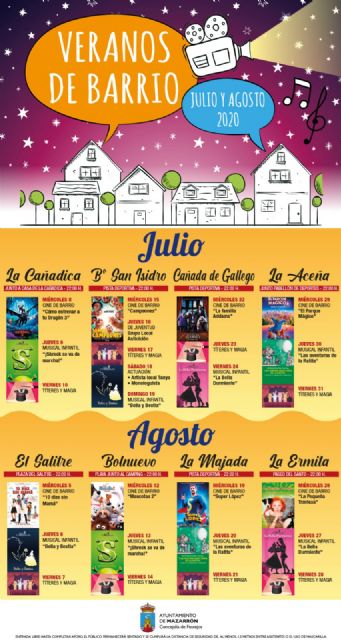 En el mes de julio se visitará el barrio de La Cañadica, San Isidro, Cañada de Callego y La Aceña, mientras que en el mes de agosto será el momento de El Salitre, Bolnuevo, La Majada y La Ermita, en cuyos espacios reservados para dicha actividad se podrá disfrutar de películas como "Super-López", "Campeones", "La Familia Addams", "El Parque Mágico", "10 Días sin Mamá", "Mascotas 2" y "La Pequeña Traviesa".