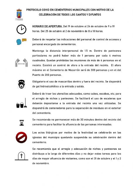 El edil responsable de Sanidad ha explicado que este año "habrá personal encargado de los accesos a los cementerios durante los días centrales de esta festividad para controlar el aforo que será de 300 personas en el de Mazarrón y 200 en el del Puerto". Asimismo, Francisco José García ha anunciado que "las personas que acudan deben hacerlo provistas de sus cubos y herramientas y tan sólo se prestarán las escaleras que serán desinfectadas una vez que un interesado las utilice".