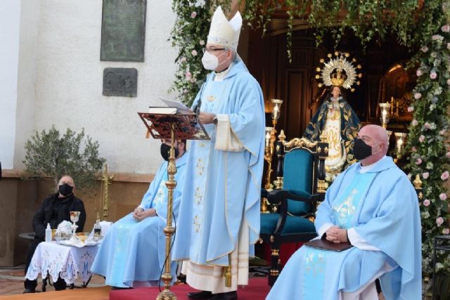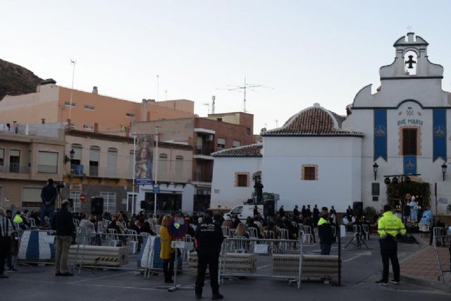 Esta tarde se ha celebrado en la Plaza del Convento, la Solemne Eucaristía en honor a la Purísima Concepción. La patrona de Mazarrón ha salido a las puertas de su Santuario para esta misa de campaña que se ha realizado bajo las medidas sanitarias pertinentes y con el fin de que pudieran asistir a la misma un mayor número de fieles que si se hubiera celebrado en el interior del templo
