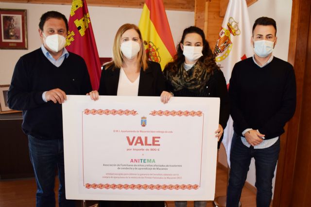 El alcalde de Mazarrón, Gaspar Miras, y el concejal de Festejos, Miguel Ángel Peña, han entregado a la Asociación de Familiares de Niños y Niñas Afectados de Trastornos de Conducta y de Aprendizaje de Mazarrón (ANITEMA) un cheque por valor de 800 euros obtenidos de la venta de la revista de las Fiestas Patronales del pasado año.