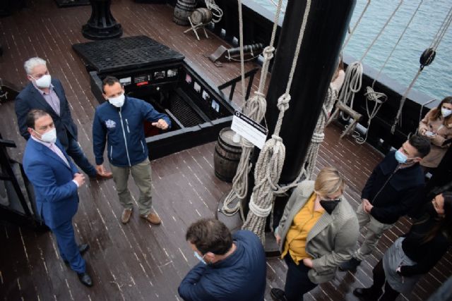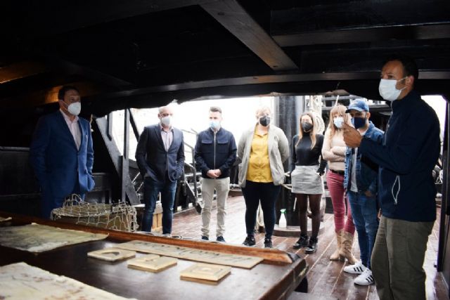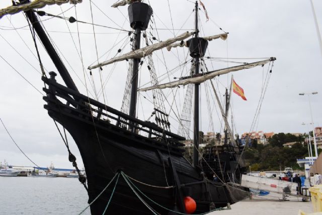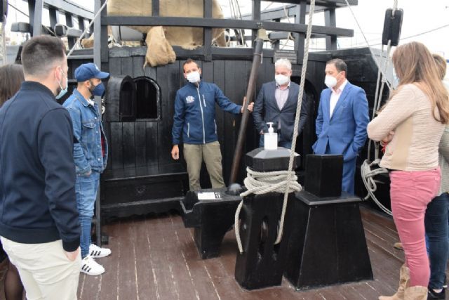 Esta mañana el alcalde de Mazarrón, Gaspar Miras, acompañado del teniente alcalde, Ginés Campillo, y los concejales del equipo de gobierno Plácida Gómez, Miguel Ángel Peña, José María Moreno, Raquel Raja y Silvia García; han visitado la réplica del la Nao Victoria, el navío que hace 500 años realizó la Primera Vuelta al Mundo y que está llevando a cabo una gira por diversos puertos de España.