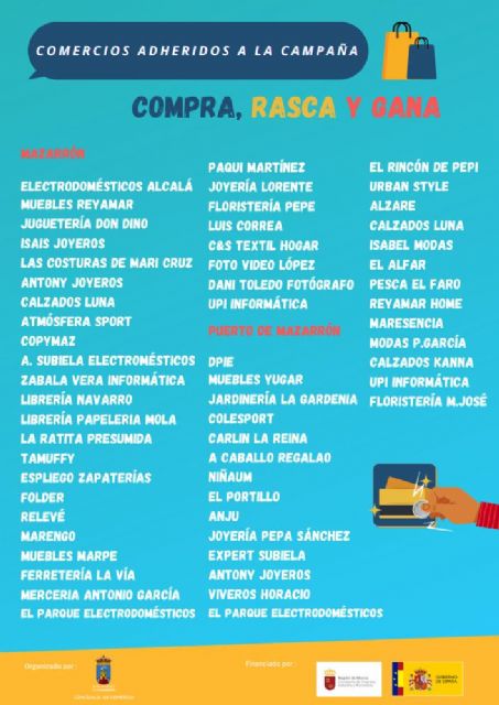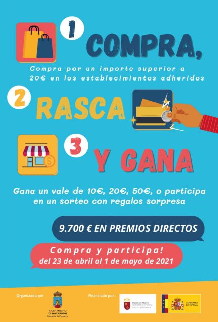 Por segunda vez, y hasta el 1 de mayo, los vecinos y visitantes que compren en los comercios de Mazarrón podrán verse premiados por realizar sus compras gracias a la iniciativa 'Compra, rasca y gana' organizada por la Concejalía de Comercio con fondos estatales para la reactivación económica provocada por la crisis sanitaria de la Covid19.