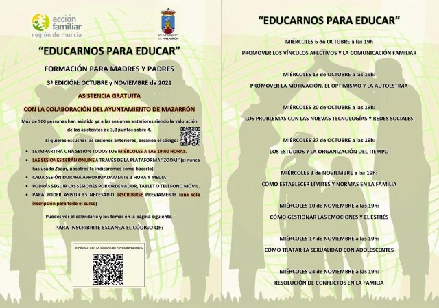 Acción Familiar Región de Murcia, realizará las acciones formativas a partir del 6 de Octubre, destinadas a madres y padres consistentes en sesiones de formación online mediante videoconferencia, difusión de otros materiales formativos, así como poner a disposición de las personas participantes un Servicio de Orientación Familiar online gratuito para hacer consultas confidenciales sobre problemas o dificultades familiares.