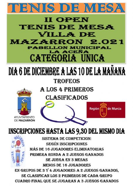 El club de Tenis de mesa ha organizado el II Open Tenis de Mesa Villa de Mazarrón 2021. Este torneo será el 6 de diciembre a partir de las 10:00 horas en el Pabellón de deportes La Aceña.