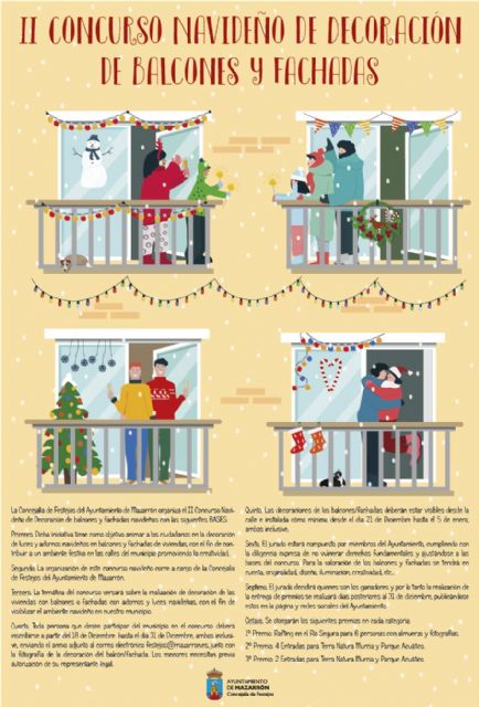 La programación contempla eventos para el gusto de todos los públicos y edades incluyendo desde Exposición de Belenes, Concurso de Decoración de Balcones y Fachadas Navideñas, Concurso de Fotografía, Mercado Navideño, Talleres de Paje Real. Y un largo etcétera que hará las delicias de todos los vecinos de Mazarrón, la programación finalizará con la Cabalgata de Reyes de Mazarrón que se iniciará en el Jardín de la Paz y caminará hacia la Avenida de la Constitución.