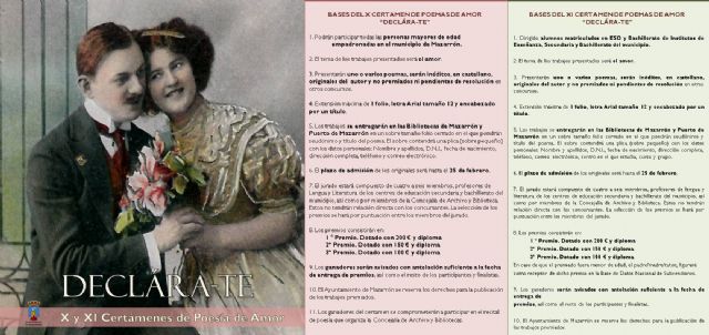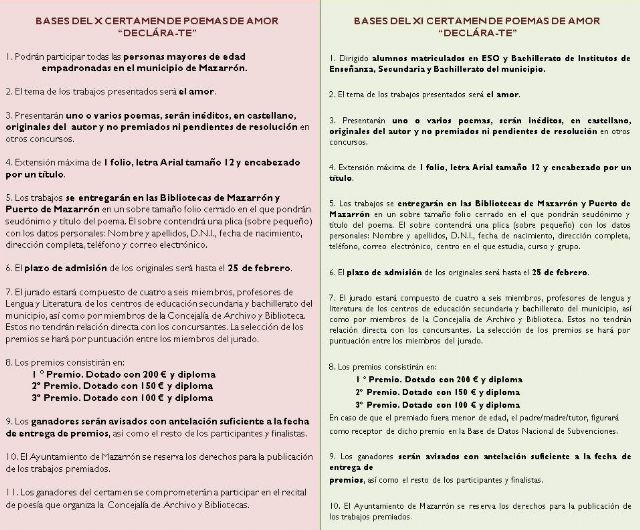 En el primero de los concursos, el X Certamen de poemas de Amor "Declára-te" podrán participar todas las personas mayores de edad empadronadas en el municipio de Mazarrón. Los trabajos deberán ser inéditos, en castellano, no premiados y bajo la temática amor.