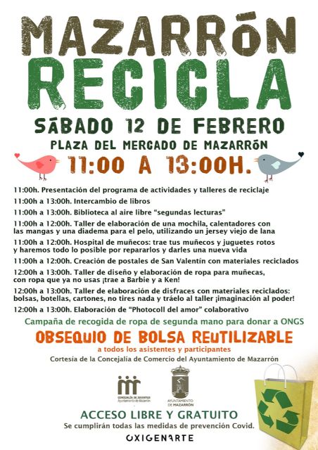 Además, para completar esta campaña, se ha involucrado a la Concejalía de Juventud, ya que la concienciación es muy importante y necesaria, y sobre todo desde las edades tempranas, transmitiendo la importancia de cuidar el medio ambiente y todo lo que con lleva reducir, reciclar… Para ello, junto a la Asociación Oxigenarte, se han preparado una serie de actividades y talleres, en donde los más pequeños podrán realizar intercambio de libros, elaborar mochilas, calentadores, diademas… trayendo sus jerséis viejos, podrán también traer sus muñecos para intentar repararlos y darles una nueva vida, y con la proximidad de San Valentín y Carnaval también se realizaran talleres de postales y disfraces con materiales reciclados.