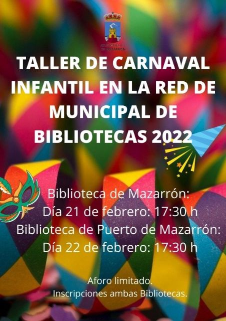 Los talleres se realizarán: El día 21 de febrero en la Biblioteca de Mazarrón a las 17:30 horas y en la Biblioteca del Puerto de Mazarrón el día 22 de febrero igualmente a las 17:30 horas.