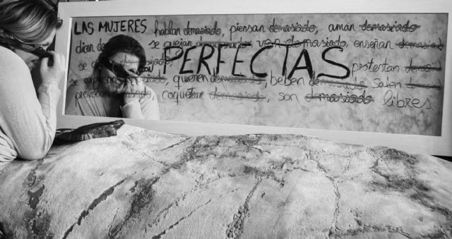 El segundo premio ha sido para la fotografía bajo el título "Demasiado". Esta imagen habla de la valentía de las mujeres para superar retos. La imagen es en blanco y negro y aparece en mayúsculas la palabra "PERFECTAS".