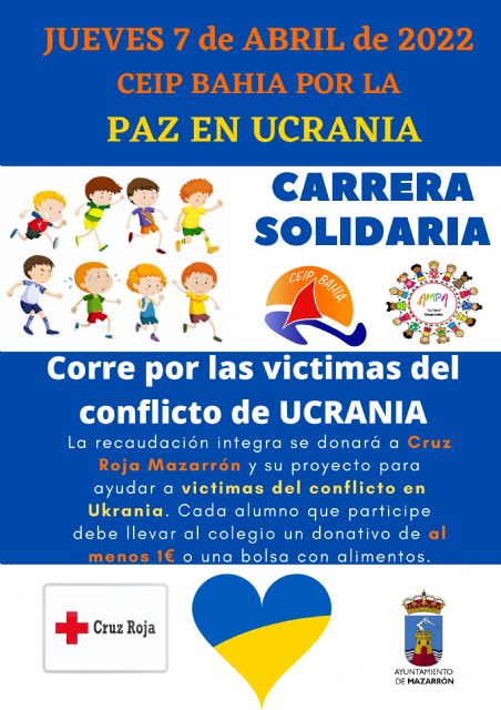 Esta marcha está organizada por el CEIP Bahía en colaboración con el Ayuntamiento de Mazarrón y la recaudación íntegra se donará a Cruz Roja Mazarrón y lo destinarán a los proyectos que hay en marcha para ayudar a las víctimas del conflicto en Ucrania.