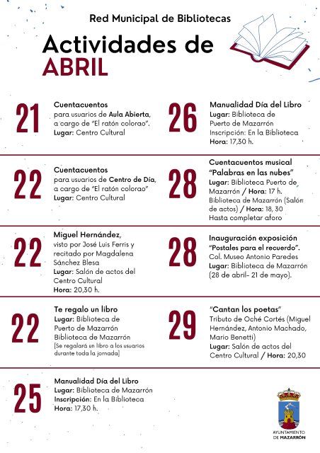 El día 25 a las 17:30 se realizará la Manualidad del Día del Libro tanto en la Biblioteca de Mazarrón. En la Biblioteca de Puerto de Mazarrón se realizará esta jornada el día 26 a las 17:30.