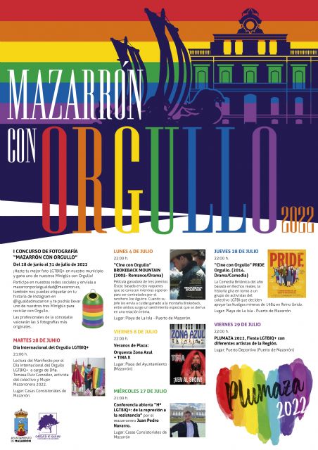 Las actividades comienzan hoy 28 de junio, día Internacional del Orgullo LGTBIQ+, con la lectura de un manifiesto a cargo de Tomasa Ruiz, activista del colectivo y Mujer Mazarronera 2022 que se realizará en las Casas Consistoriales a las 21,00h. Se dará inicio también al I Concurso de fotografía "Mazarrón con Orgullo".