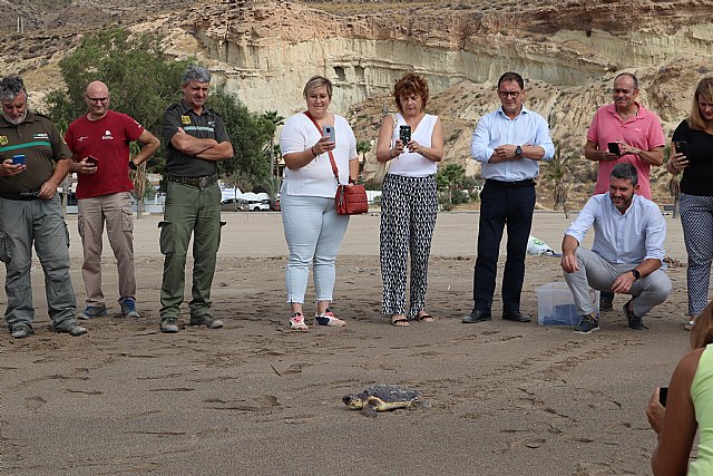El consejero de Agua, Agricultura, Ganadería, Pesca, Medio Ambiente y Emergencias, Antonio Luengo, participó hoy junto al alcalde de Mazarrón Gaspar Miras, y las concejalas de Medio Ambiente Plácida Gómez y Servicios del Litoral Raquel Raja, en la playa de Bolnuevo en la liberación de un ejemplar juvenil de tortuga boba (caretta caretta) que había sufrido un enmallamiento en artes de pesca ilegales en área de La Azohía.