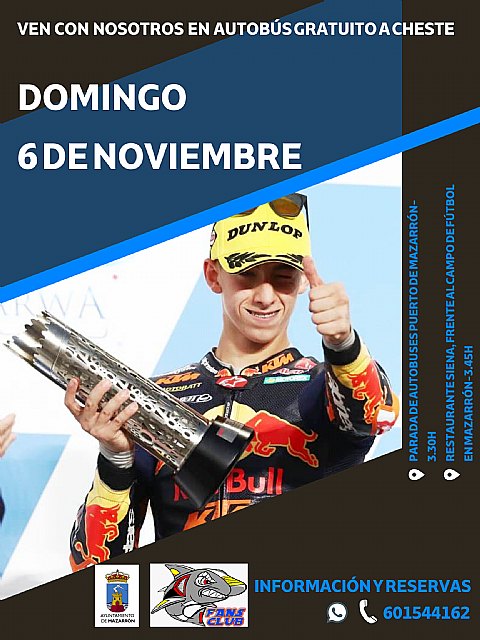 El próximo 6 de noviembre saldrá el autobús que pone a disposición de los aficionados el Ayuntamiento de Mazarrón, para poder asistir a la última carrera de la temporada del Mundial de Motociclismo donde se decidirán los títulos de MotoGP y Moto2.