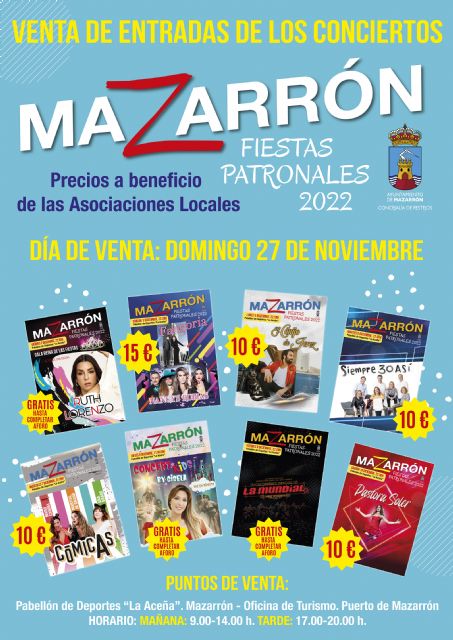 El próximo domingo 27 de noviembre se pondrán a la venta las entradas para los conciertos de las Fiestas Patronales de Mazarrón. El dinero recaudado con la venta de las entradas se destinará a las siguientes asociaciones municipales: Cruz Roja Mazarrón, Cáritas Mazarrón, Cáritas Puertos de Mazarrón, AECC, D'Genes, Nuevo Rumbo, Anitema, Aproama, Afibromaz, Aspadem y Santuario Animalista.
