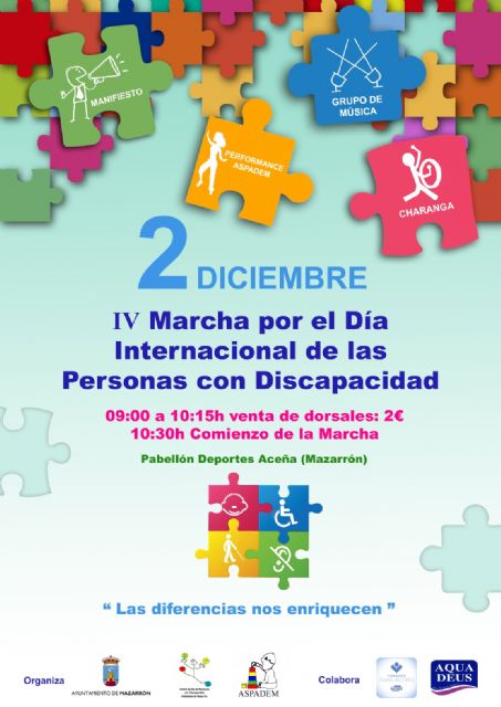 Con motivo de la celebración, el próximo 2 de diciembre y bajo el lema “LAS DIFERENCIAS NOS ENRIQUECEN” se han preparado diferentes actividades que comenzarán a las 9,00h con la entrega de dorsales para la IV Marcha por el Día Internacional de las Personas con Discapacidad, tras ello se hará la lectura del manifiesto programado a las 11,30h, también se contará con una performance a cargo de ASPADEM para finalizar con una actuación musical y comida de convivencia para usuarios y familiares del Centro.