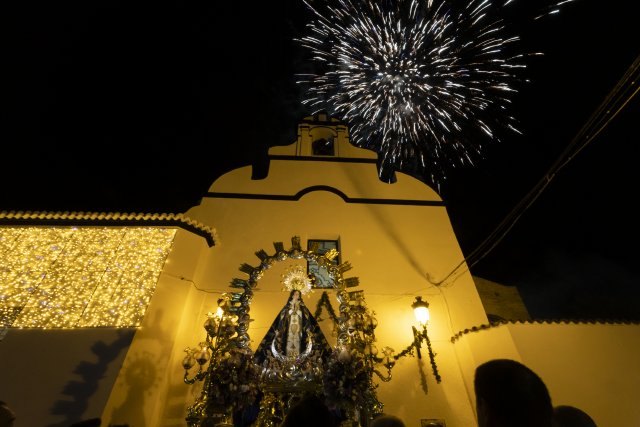 A su regreso al templo, la patrona fue honrada con un castillo de fuegos artificiales y una gran petalá, una lluvia de color que también se repitió en diferentes momentos del cortejo procesional.