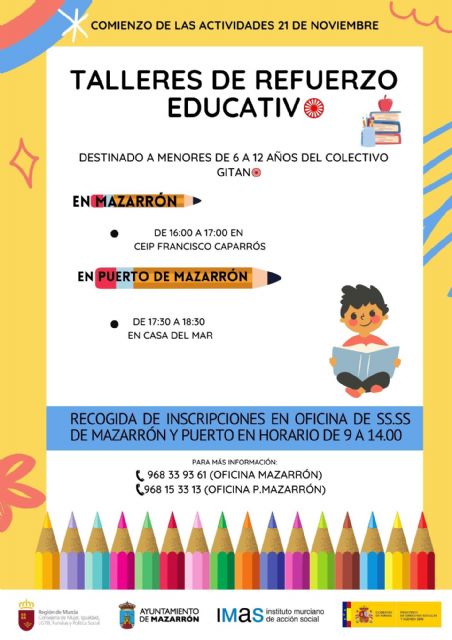Este programa se desarrolla en el marco del Plan de Desarrollo Gitano, subvencionado por la Consejería de Mujer, Igualdad, LGTBI, Familias y Política Social a través del Instituto Murciano de Acción Social en colaboración con el Ayuntamiento de Mazarrón.