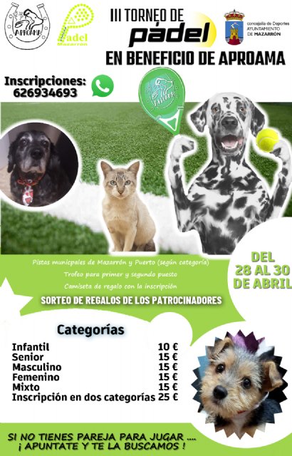 Llega el III Torneo de Pádel en beneficio de Aproama. La cita dará comienzo el próximo viernes a partir de las 16,00h, y continuará durante todo el día del sábado para celebrar todas las finales el domingo 30 de abril por la mañana. Se disputarán en las pistas municipales de Mazarrón y puerto de Mazarrón. Los partidos de la categoría "Mayores de 60" se jugarán en las pistas de Puerto de Mazarrón y el resto de categorías (Infantil, Masculino, Femenino y Mixto) en las pistas de Mazarrón.
