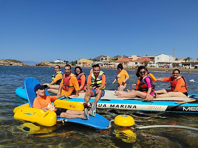 Una treintena de usuarios del Centro de día de Personas con Discapacidad Intelectual de Mazarrón y sus monitores disfrutaron el viernes 23 de junio de una mañana de deportes náuticos adaptados en la playa de la Reya.