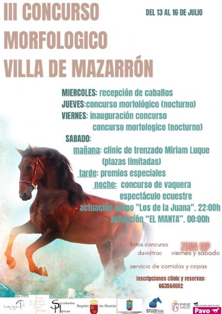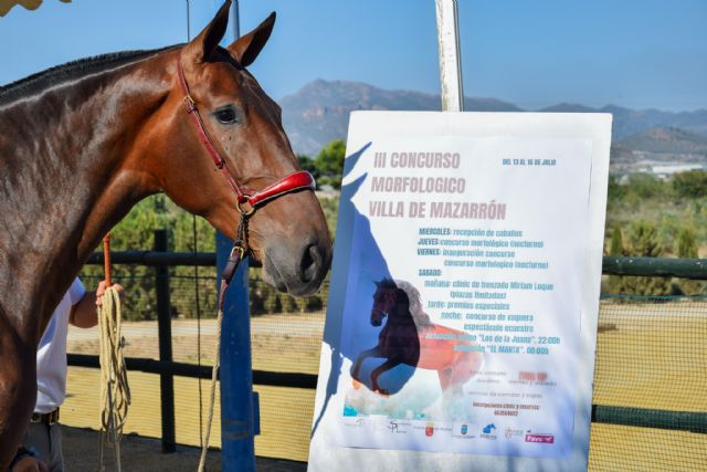 La pedanía mazarronera de Leiva volverá a ser, por unos días, el epicentro de la afición por el mundo ecuestre con la celebración, del 13 al 16 de julio, del III Concurso Morfológico ‘Villa de Mazarrón’ que organiza el Club Hípico ‘Virgen del Milagro’ con la colaboración de la Concejalía de Deportes del Ayuntamiento de Mazarrón. La concejala del ramo, María Isabel Carrillo, ha sido la encargada de presentar a los medios de comunicaciel evento equino junto al concejal de Desarrollo Rural, Andrés Aznar, y el presidente del club, Pedro Nieto.