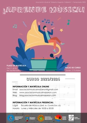 Hasta el 24 de septiembre se encuentra abierto el plazo de matrícula en la Escuela de Música de Mazarrón, que dirige la Asociación Musical Maestro Eugenio Calderón. Todas las personas interesadas en inscribirse o recibir información podrán acudir a la sede provisional de la Escuela de Música, en la Avenida Constitución, número 65 (en el edificio de la antigua Universidad Popular y actualmente denominado CIME) en horario de 18:00 a 20:00 horas los lunes y miércoles.