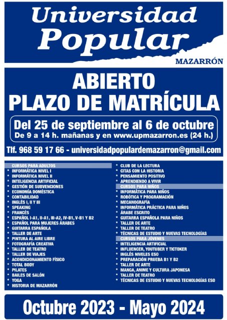 La Universidad Popular de Mazarrón, ente autónomo dependiente de la Concejalía de Cultura del Ayuntamiento de Mazarrón, establecerá entre el lunes 25 de septiembre y el 6 de octubre el plazo de matrícula en sus cursos y talleres.