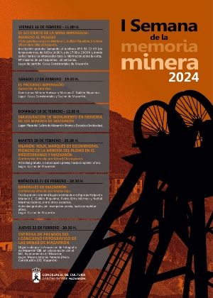 La semana arrancará con un concurso fotográfico dedicado al paisaje de las minas de Mazarrón organizado por la Asociación F20. También, el viernes 16 de febrero a las 11:00 horas se conmemorará el 131 aniversario del accidente de la mina Impensada con una visita a cargo del cronista Mariano Guillén, quien detallará los sucesos de aquel trágico día. La visita se cerrará con el arrojo de 28 rosas rojas al pozo de la tragedia en memoria de los 28 trabajadores que perecieron aquel día.