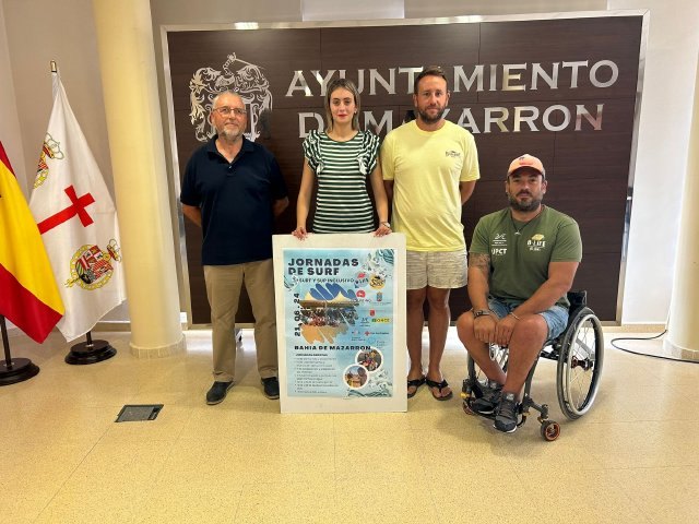 La concejal de Deportes, María Isabel Carrillo, junto con miembros de la Escuela de Surf de Bahía y de B Life, ha presentado la jornada de surf adaptado. El próximo 21 de junio, la playa de Bahía será el escenario de una jornada especial de surf adaptado, organizada por la Escuela de Surf de Bahía, la Federación de Surf de la Región de Murcia y la Concejalía de Deportes del Ayuntamiento de Mazarrón.