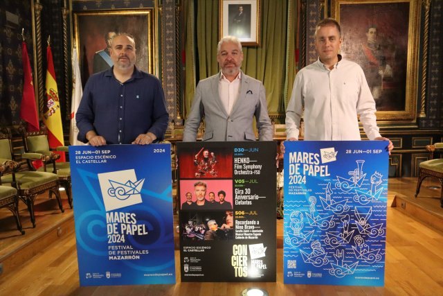 El alcalde de Mazarrón, Ginés Campillo, junto al concejal de Cultura, Jorge Durán, y el promotor de eventos, Manolo Sotomayor, han anunciado las tres primeras fechas del esperado Festival Mares de Papel, que este año experimentará un cambio de ubicación, trasladándose al espacio escénico 'El Castellar' en Playa Grande.