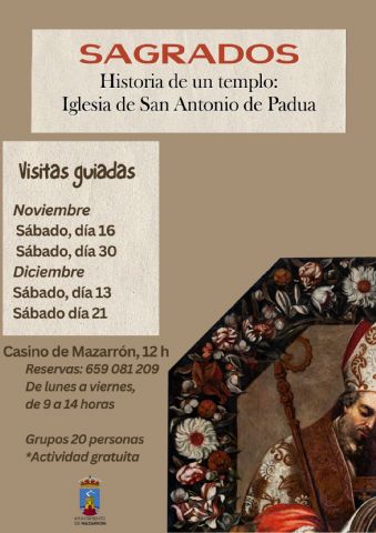 La concejalía de Cultura ha organizado cuatro visitas guiadas a la exposición "Sagrados. Historia de un templo. La iglesia de San Antonio de Padua de Mazarrón”. Se realizarán los días 16 y 30 de noviembre y los días 13 y 21 de diciembre, a las 12 horas. El guía será el comisario de la exposición, Alfonso Hernández Campillo.