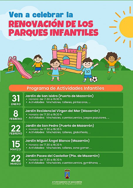 El alcalde de Mazarrón, Ginés Campillo, junto con el concejal de Parques y Jardines, Tomás Ureña, han presentado esta mañana el programa de actividades que se ha organizado para conmemorar la renovación de los parques infantiles del municipio. Con esta iniciativa, el Ayuntamiento busca ofrecer a las familias un espacio de ocio renovado y seguro, fomentando la convivencia y el disfrute de los más pequeños, además tal y como ha declarado el alcalde, todos los parques cuentan con espacios adaptados para personas de movilidad reducida.