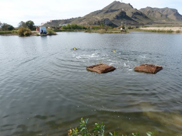Los participantes del 'Día Mundial de los Humedales' instalan unas islas flotantes artificiales en el humedal para proteger a la avifauna