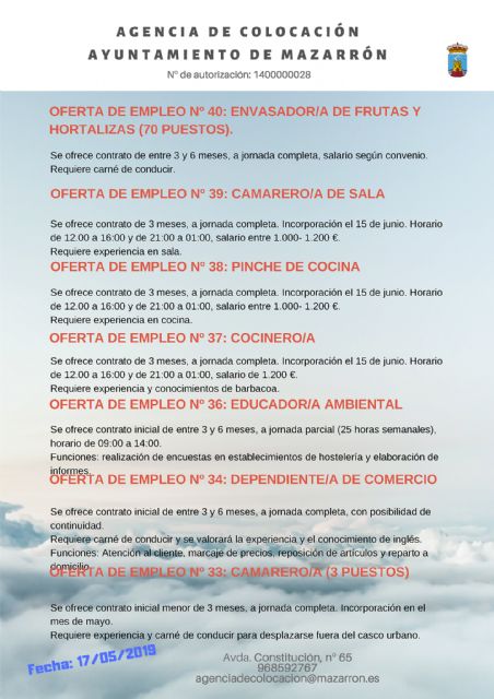 70 puestos de envasador de frutas y hortalizas, 1 educador ambiental, 4 puestos de camarero y otros de cocinero, pinche de cocina y dependiente. Más información en el CIME, en la Avenida de la Constitución de Mazarrón